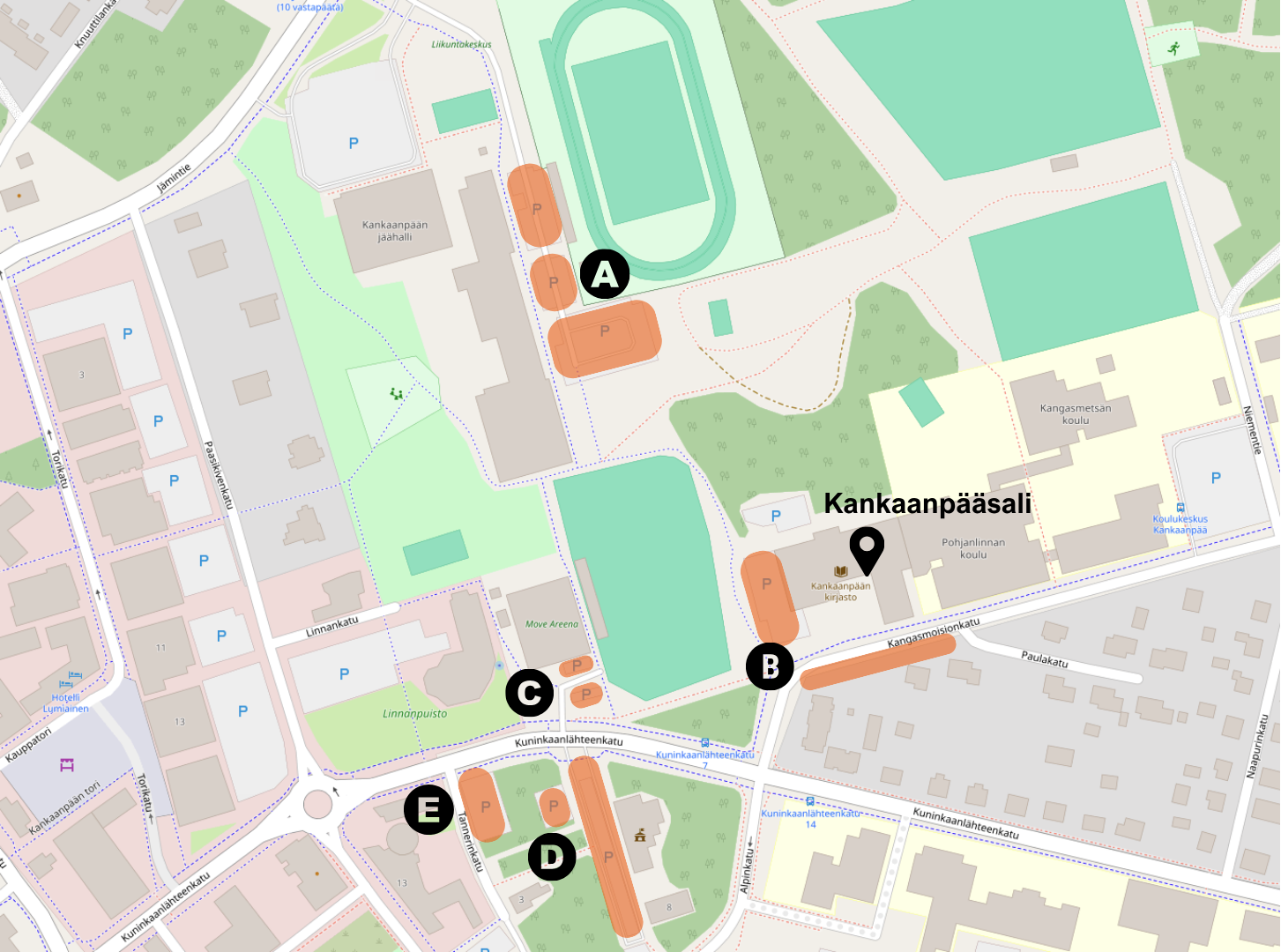 Parkkipaikat on merkitty kuvaan oranssilla. Ne ovat ilmaisia, ja sijaitsevat kävelymatkan etäisyydellä Kankaanpääsalista.